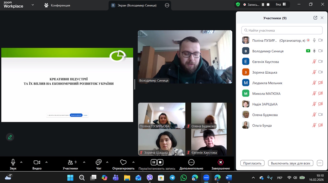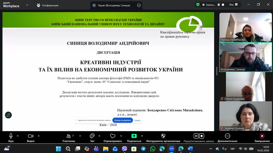 On February 16, 2026, the Department of Economics held a public presentation of the scientific results of the dissertation by V. Synytsia on the topic «Creative Industries and Their Impact on the Economic Development of Ukraine» in the specialty 051 Economics, research supervisor Doctor of Economics, Associate Professor S. Bondarenko.