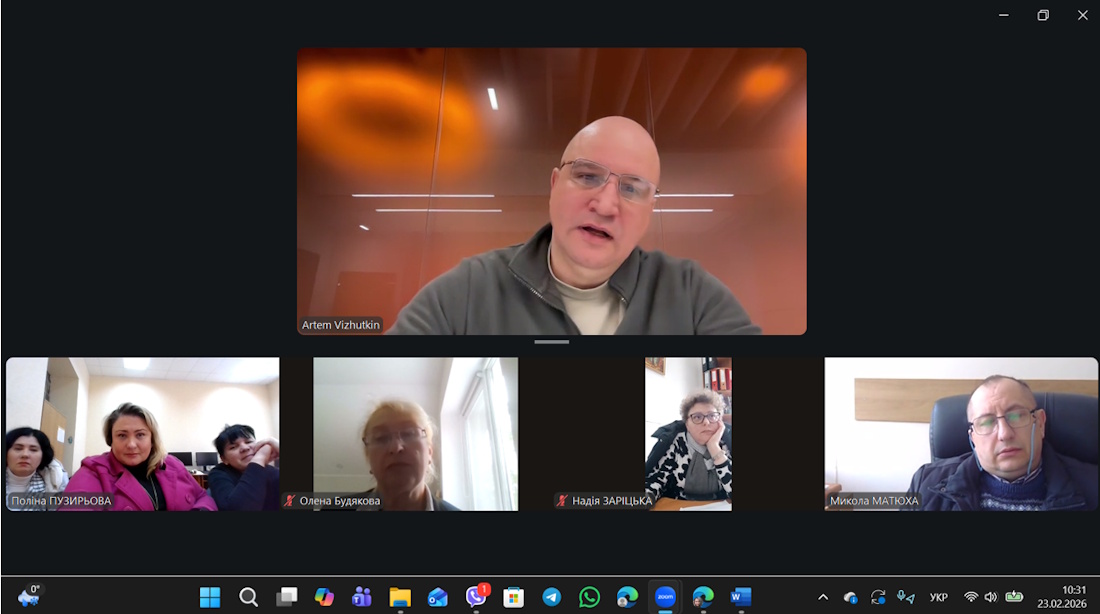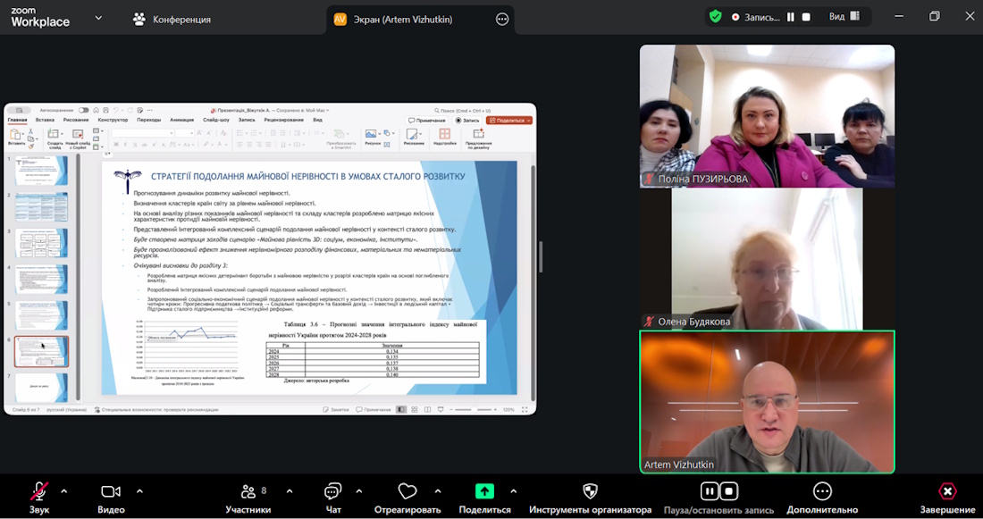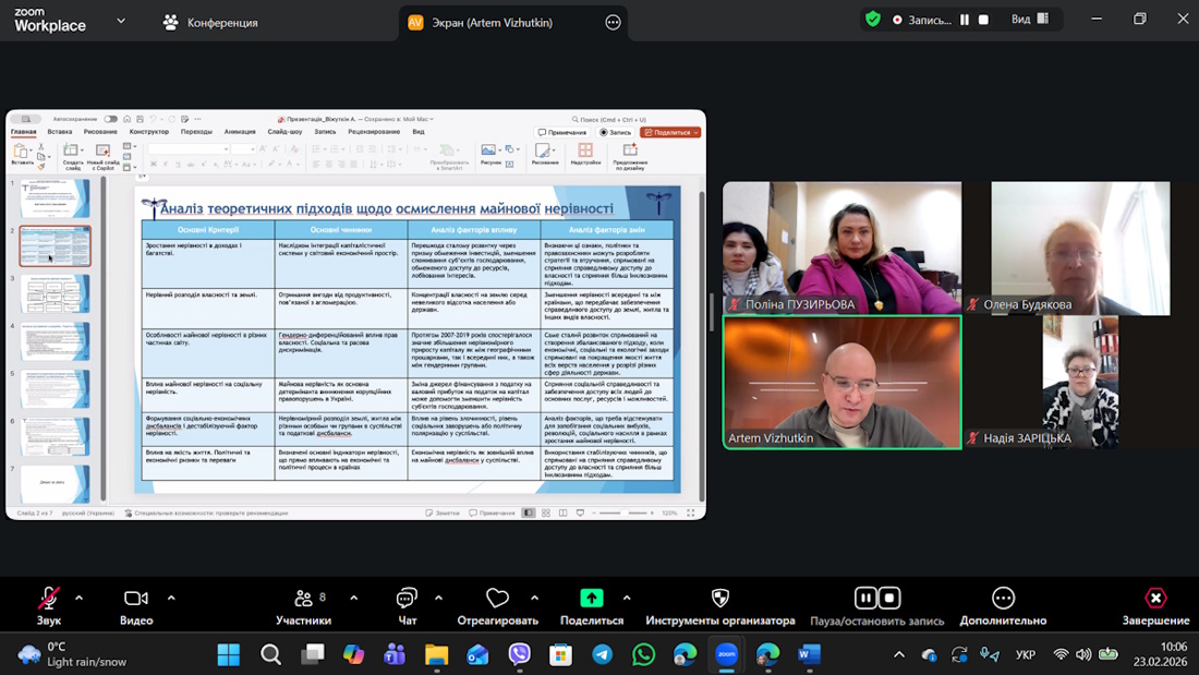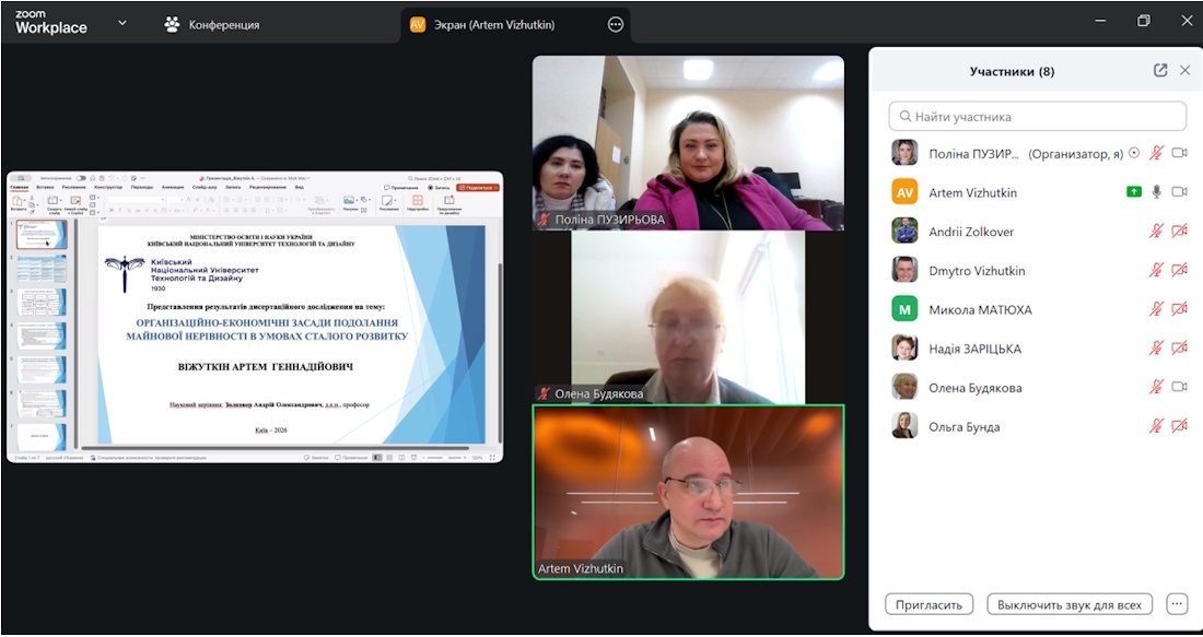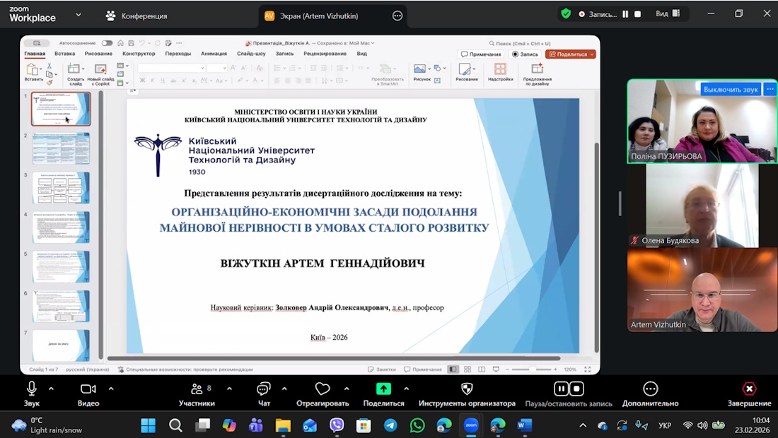 On February 23, 2026, the Department of Economics held a public presentation of the research results of the dissertation of A. Vizhutkin, a 4th-year PhD student in the specialty 051 Economics on the topic «Organizational and economic tools for overcoming property inequality in the context of sustainable development», research supervisor Doctor of Economics, Prof. A. Zolkоver.