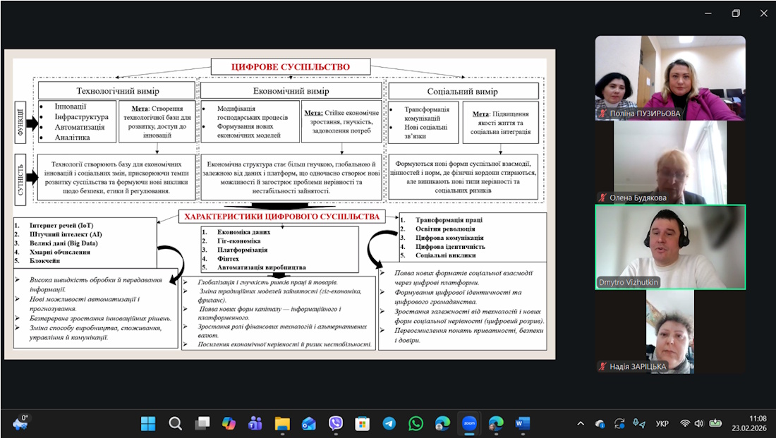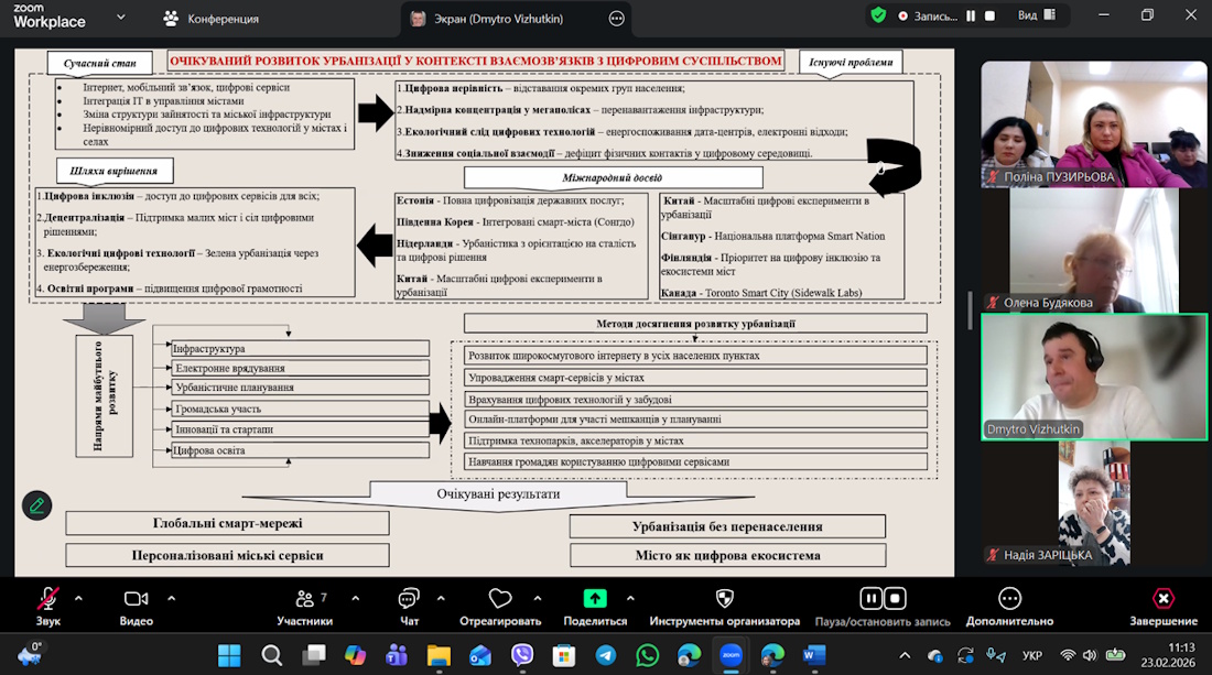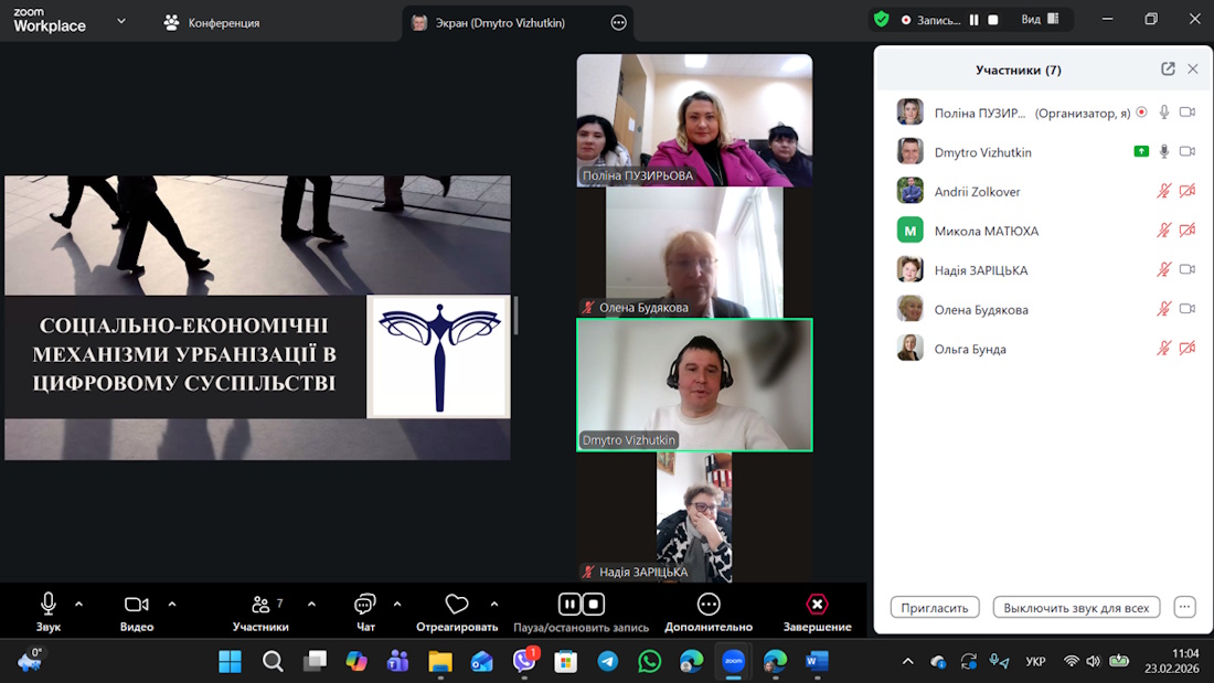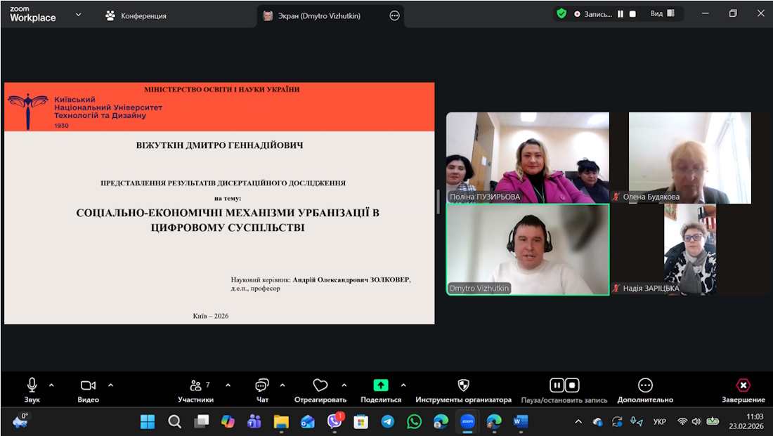 On February 23, 2026, the Department of Economics held another public presentation of the research results of the dissertation of D. Vizhutkin, a 4th-year PhD student in the specialty 051 Economics, on the topic «Socio-economic mechanisms of urbanization in a digital society», research supervisor Doctor of Economics, Prof. A. Zolkover.