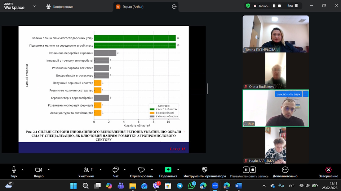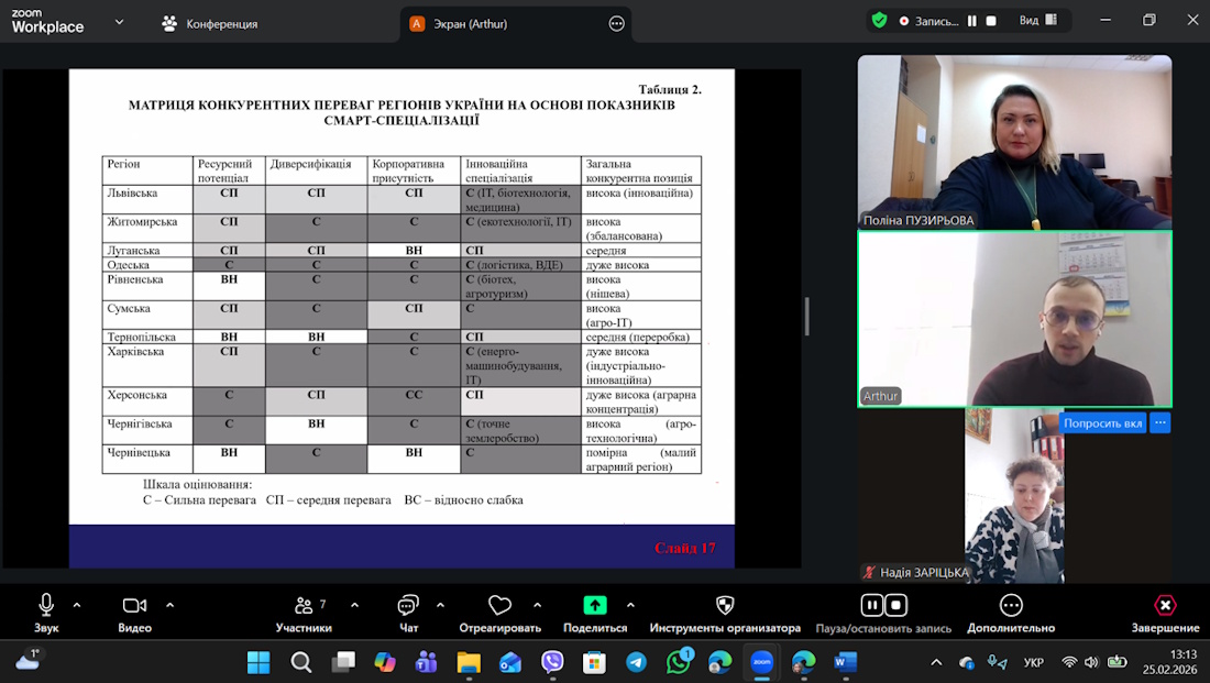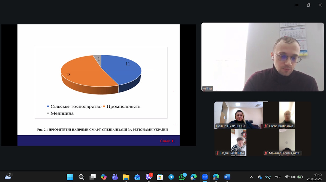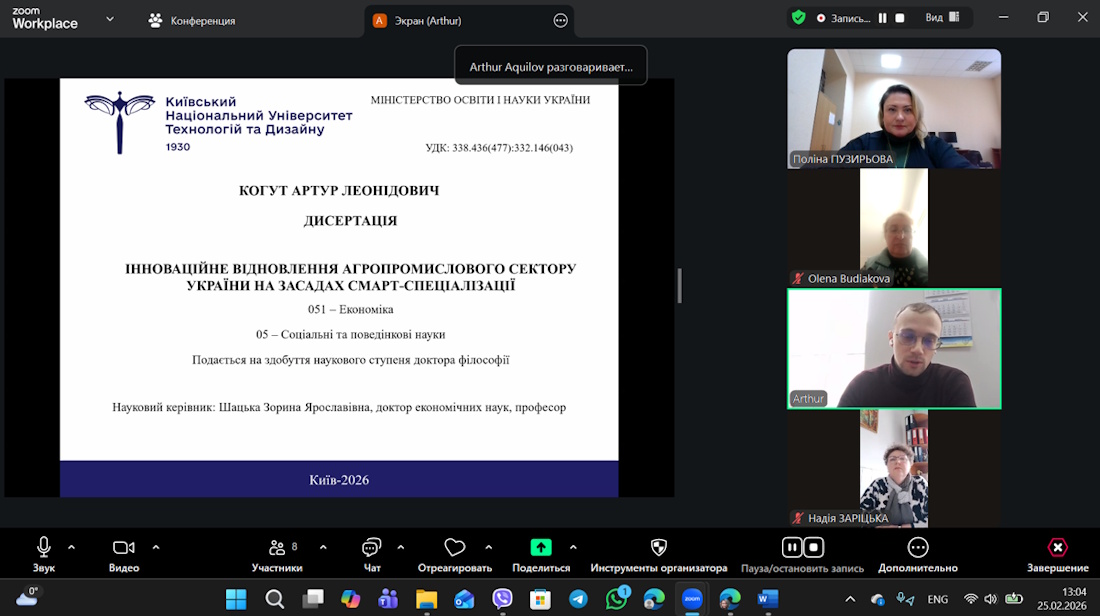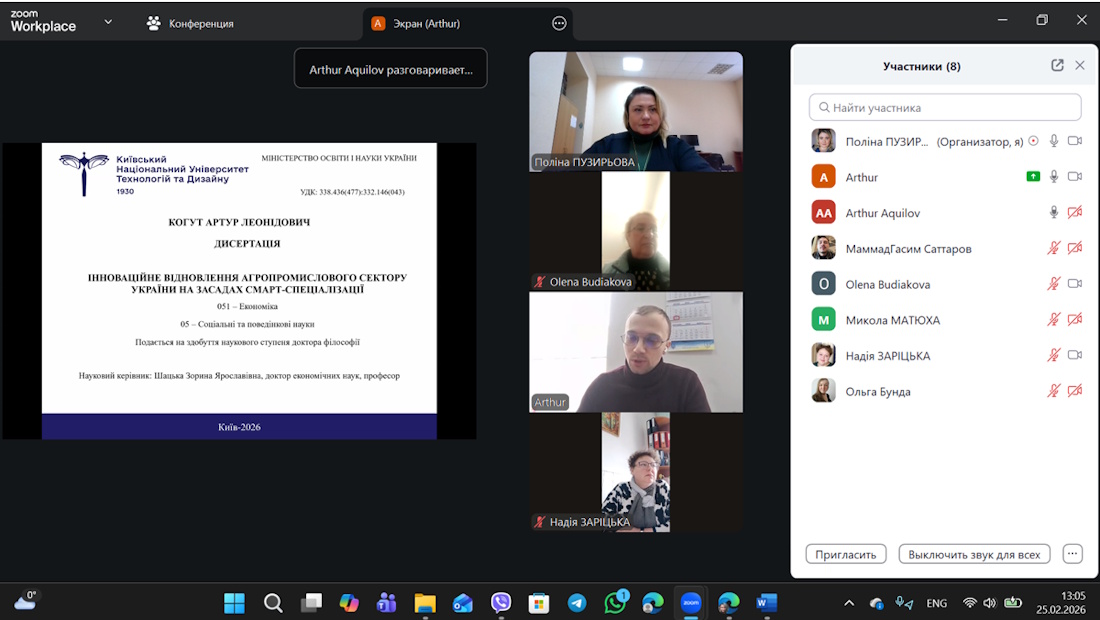 On February 25, 2026, the Department of Economics held a public presentation of the research results of the dissertation of 4th-year PhD student A. Kogut on the topic «Innovative restoration of the agro-industrial sector of Ukraine based on smart specialization», research supervisor Doctor of Economics, Prof. Z. Shatska, in the specialty 051 Economics.