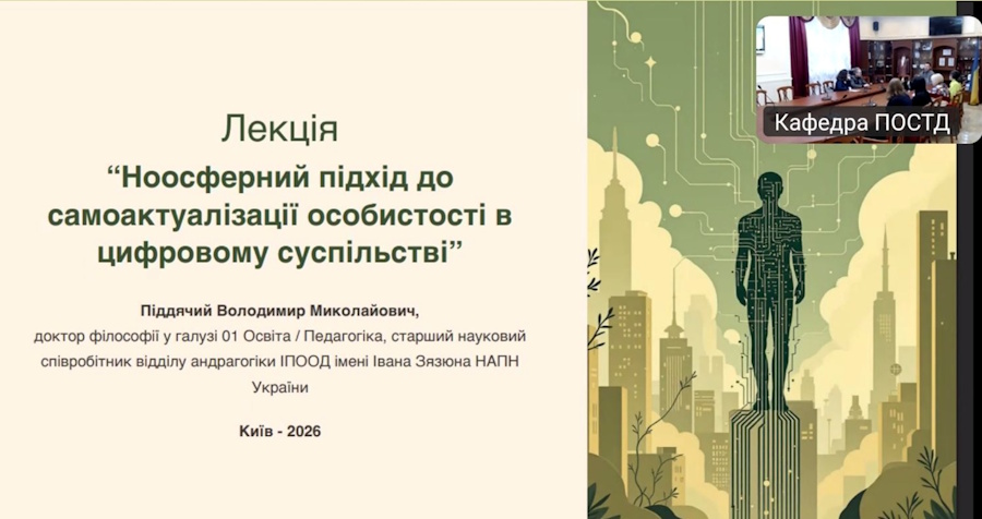 On 25 February 2026, Kyiv National University of Technologies and Design hosted a guest lecture for higher education students majoring in C4/053 “Psychology” by Volodymyr Piddiachyi, PhD, Senior Research Fellow at the Department of Andragogy of the Ivan Ziaziun Institute of Pedagogical Education and Adult Education of the National Academy of Pedagogical Sciences of Ukraine, on the topic “The Noospheric Approach to Self-Actualisation of the Individual in a Digital Society”. The invitation of the lecturer was initiated by Alla Semenova, Doctor of Pedagogical Sciences, Professor, Head of the Department of Professional Education in Technology and Design at Kyiv National University of Technologies and Design, who acted as moderator and co-organiser of the event. The event was implemented within the framework of a cooperation agreement between the institutions, which consistently expands students’ educational opportunities and strengthens the practice-oriented component of training future psychologists.