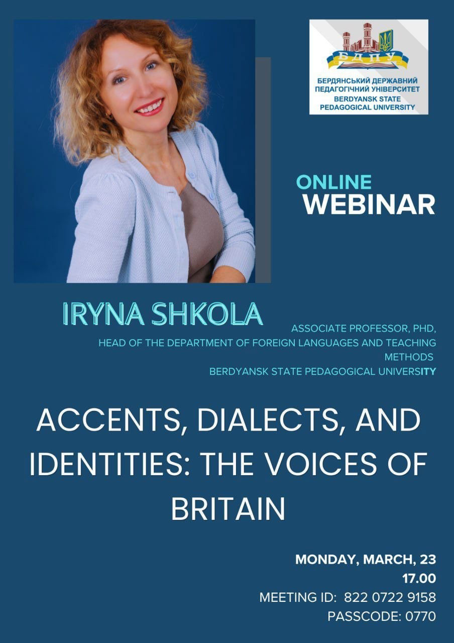 The lecturer – Iryna Shkola, Ph.D. in Philology, Associate Professor, and Head of the Department of Foreign Languages and Teaching Methods at Berdiansk State Pedagogical University – introduced the audience to the diversity of British dialects and accents.