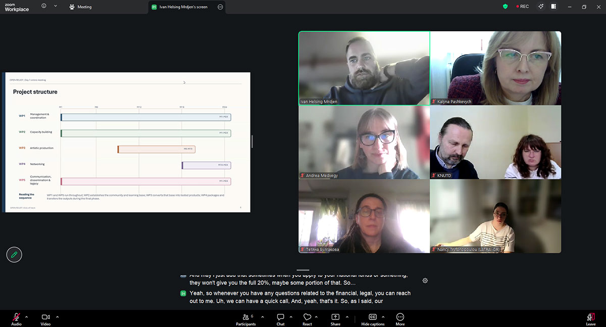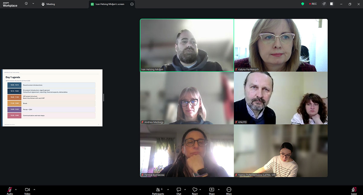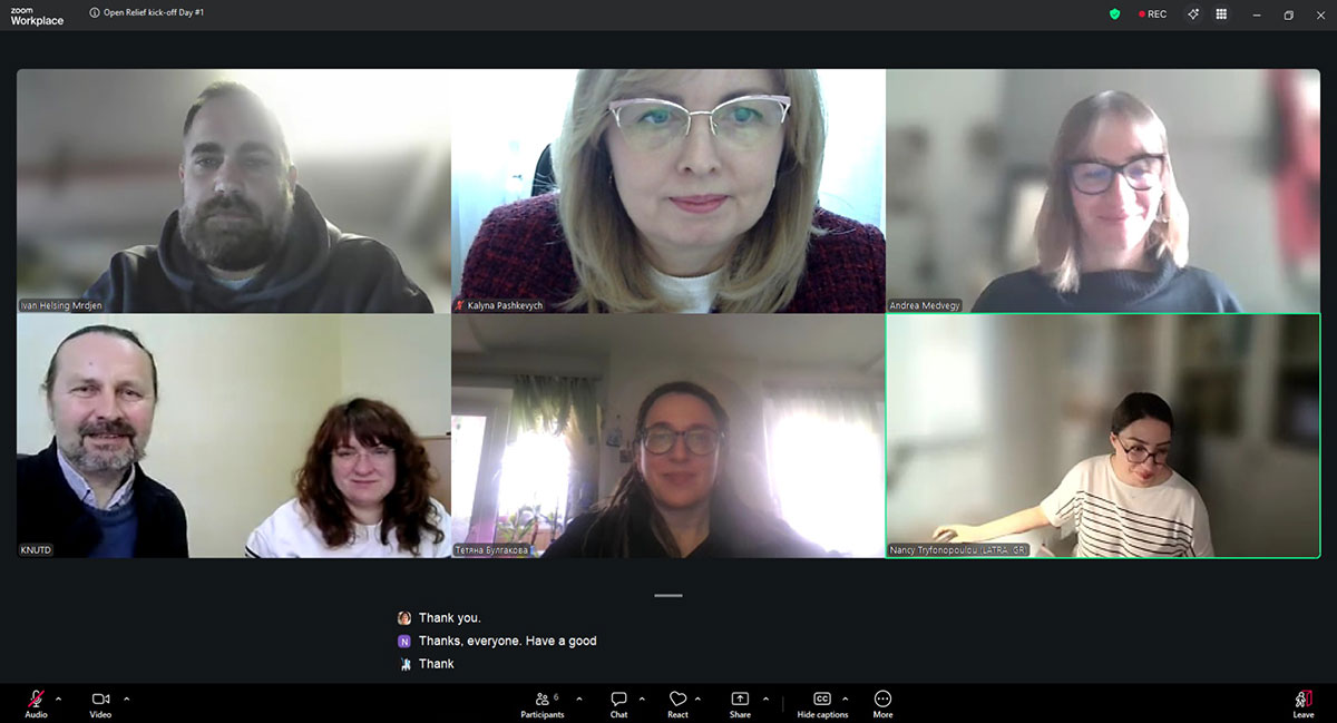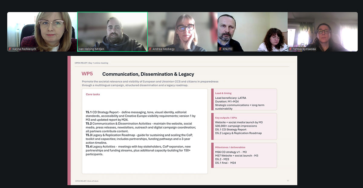 On March 24 and 27, 2026, the kick-off meeting of the participants in the international consortium for the OPEN RELIEF grant project, funded under the European Union’s “Creative Europe” program CREA-CULT-2025-COOP, was held online. The consortium includes IM Industries (Croatia), LATRA (Greece), and Kyiv National University of Technologies and Design. Representing KNUTD at the meeting were the project leader, Head of the Department of Interior and Furniture Design, Danylo Kosenko, and working group members – Dean of the Faculty of Design Kalyna Pashkevych, Associate Professors of the Department of Interior and Furniture Design Tetiana Bulgakova and Oleksandra Shmeliova-Nesterenko.