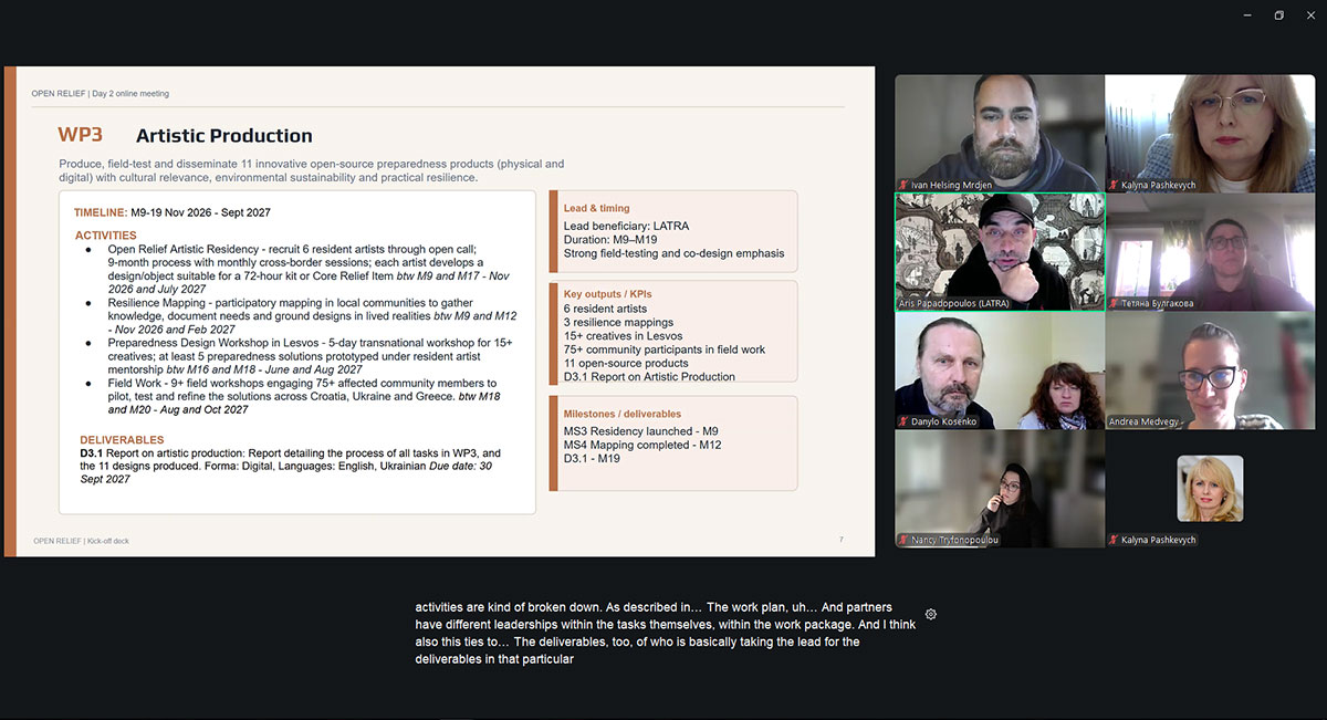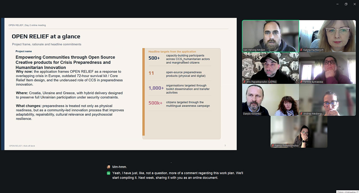 The project “Empowering Communities through Open Source Creative Solutions for Crisis Preparedness and Humanitarian Innovation” (OPEN RELIEF) is funded by the “Creative Europe” program and aims to enable cultural and creative sector professionals to jointly develop sustainable, repairable, and scalable humanitarian solutions – such as survival kits and shelters – in collaboration with NGOs and communities in Ukraine, Croatia, and Greece to enhance crisis preparedness and resilience.