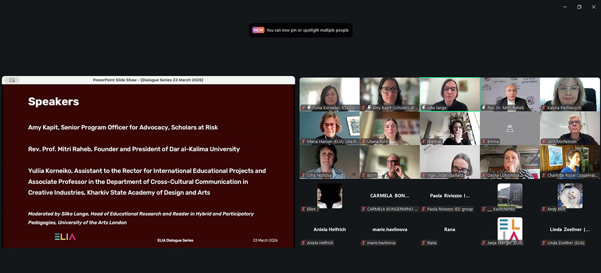 On March 23, 2026, representatives of the Faculty of Design of KNUTD participated in the ELIA Dialogue Series 2026 webinar of the European League of Institutions of Art ELIA, of which KNUTD has been a member since 2024.