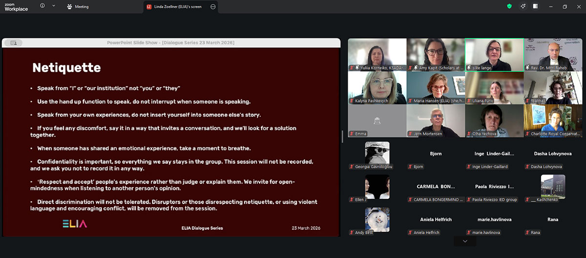 The ELIA Dialogue Series was launched in 2024 as an online space where higher art education communities, international experts and thought leaders could meet to address pressing issues facing higher art education institutions in times of crisis and conflict.