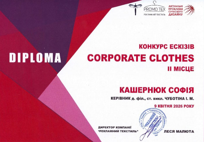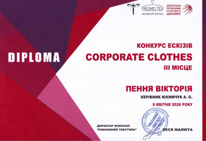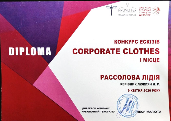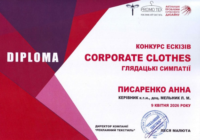 On April 9, 2026, an authoritative jury headed by Lesіa Malіuta, director of the company "PROMO TEX", summed up the results of the competition. The event took place within the framework of the plenary session of the VIIIth International Scientific and Practical Conference "Topic Issues of Modern Design".
