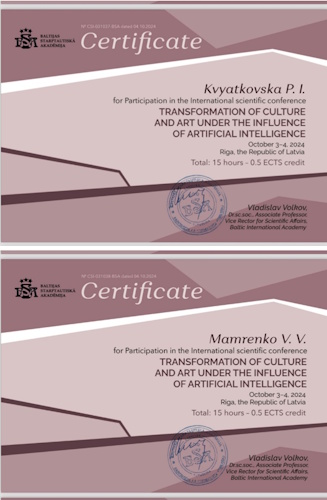 During the reporting period, 3 students took part in creative competitions, 2 students in the International Scientific Conference “Transformation of the Sphere of Culture and Art under the Influence of Artificial Intelligence”, October 3–4, 2024, Riga, Republic of Latvia, and 4 students in the IV All-Ukrainian Scientific and Practical Conference “Integration of Science and Education: Development of Cultural and Creative Industries”. April 10, 2025, Kyiv, Kyiv National University of Technologies and Design.
