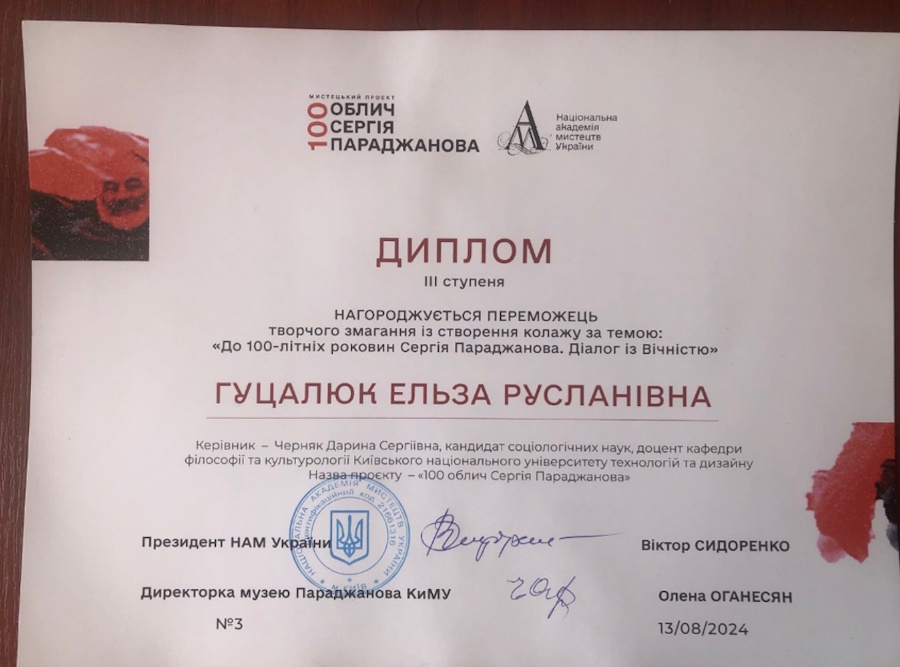The residents of Hurtkiv participated in the art project “One Hundred Faces of Paradzhanov” and creative competitions to create a collage on the theme “To the 100th anniversary of S. Paradzhanov. Dialogue with Eternity”. The diploma of the 3rd degree was received by Gutsalyuk E.R. The diplomas were presented by the president of the National Academy of Arts V. Sydorenko and the director of the Paradzhanov Museum O. Oganesyan.