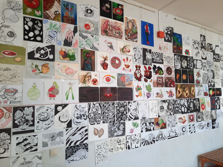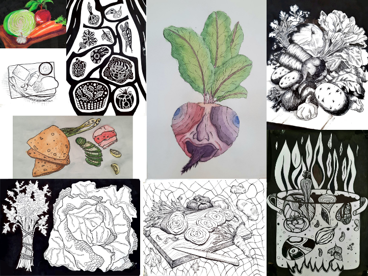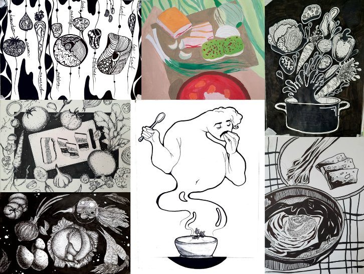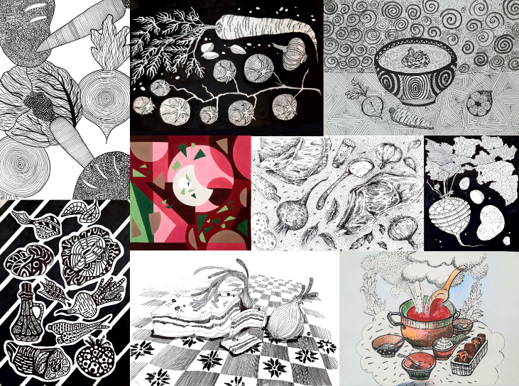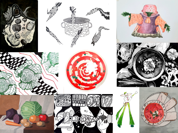 Students of the “Digital Art” and “Graphic Design” programmes created their own interpretations of traditional Ukrainian motifs, combining a variety of techniques. The important task was not only to convey the form, texture and colour of objects but also to explore compositional solutions, rhythm and dynamics of sketches, seeking original approaches in their creative work. The red palette of borscht, the contrasting textures of the ingredients, and the geometry of vegetable components were all transformed into a language of plastic experimentation.