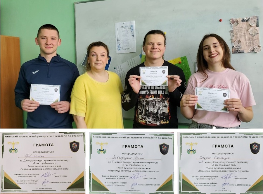 Members of the student scientific club “The Art of Translation”, supervised by Associate Professor of the Department of Philology and Translation, PhD in Philology Natalia Gudkova, took an active part in the events of the Modern Foreign Languages Week “Translation: Vision, Mastery, Flexibility”, dedicated to the International Translation Day, held at Kyiv National University of Technologies and Design from 29 September to 3 October 2025.