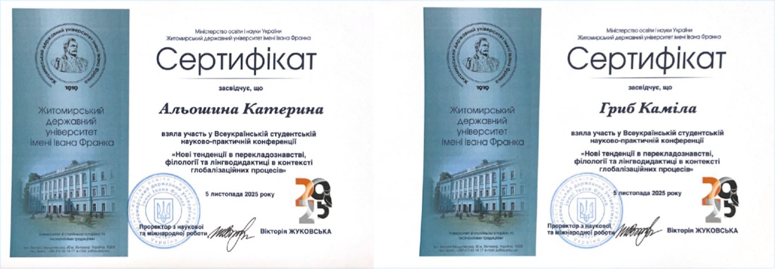 As a result of their participation in the All-Ukrainian Student Scientific and Practical Conference “New Trends in Translation Studies, Philology, and Linguodidactics in the Context of Globalization Processes,” students of the BAM-23 group, Kamila Hryb and Kateryna Aloshyna, received certificates of participation.