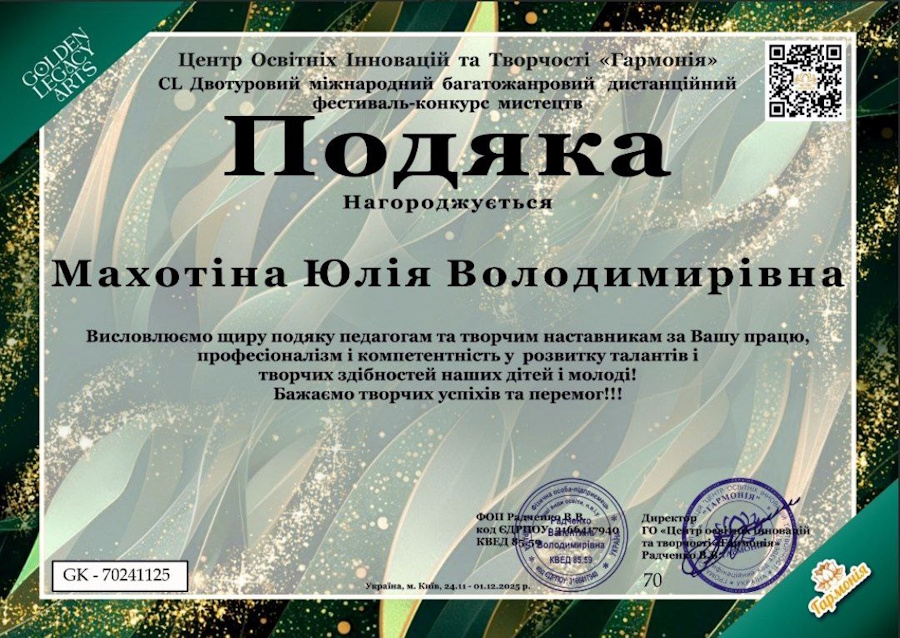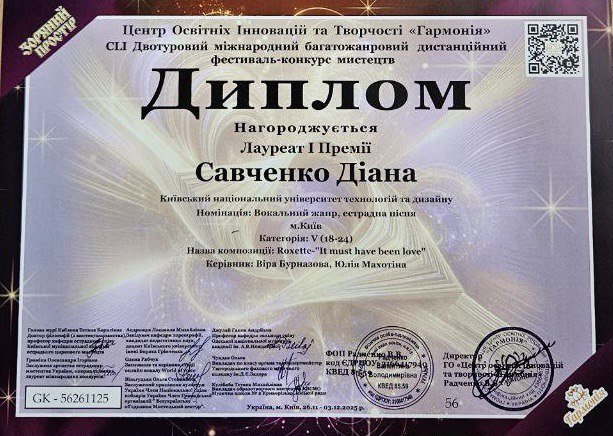 The results of the performance were confirmed by honorary awards. The students demonstrated a high level of vocal training, showing free command of their voices. Each participant received official recognition, which added to the professional portfolios of our future actors. The certificates awarded to the winners were the best proof of the club's effectiveness. The first prize diplomas were awarded to students Diana Savchenko, Yelyzaveta Hladun, and Valeria Gryzhak; the second prize diploma was awarded to Kira Stulnikova (“ZORYANYI PROSTIR”). The diploma of the winner of the First Prize was awarded to Karina Prokopenko; the diplomas of the winners of the Second Prize were awarded to Sofia Pukhalskaya and Daria Torianik (“GOLDEN LEGACY ARTS”). The head of the student research group, Vira Burnazova, and the leading accompanist of the department, Yulia Makhotina, were also recognized for their creative mentorship.