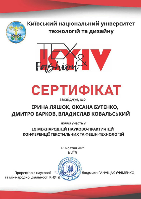 In addition to laboratory research, club members actively presented their achievements at international scientific venues, including the II International Scientific and Practical Conference dedicated to the 95th anniversary of Kyiv National University of Technologies and Design, “Innovative Materials and Technologies: Biotechnology, Applied Chemistry, Ecology” (Kyiv, 30-31 October 2025), as well as the IX International Scientific and Practical Conference on Textile and Fashion Technologies (Kyiv, 16 October 2025).