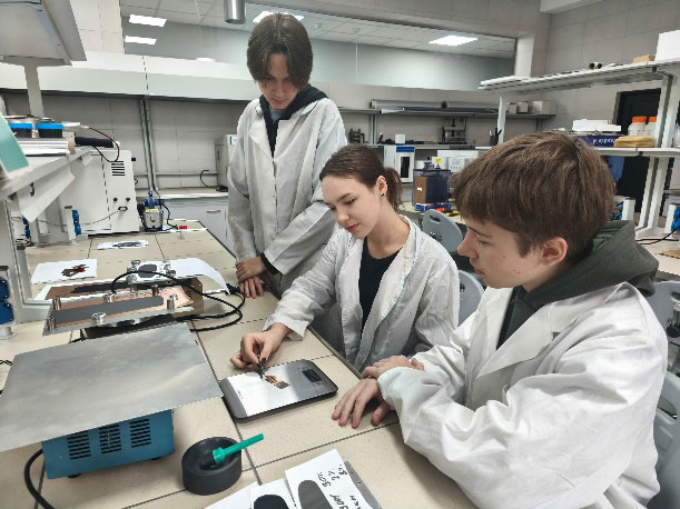 Meetings were held monthly in accordance with the approved plan, bringing together future specialists to study the complex processes involved in electromagnetic radiation shielding. Club members had a unique opportunity to progress from abstract ideas to real prototypes. In the laboratory, they synthesized electrically conductive polymer coatings, examined their structure under a microscope, and tested their ability to block electromagnetic signals.