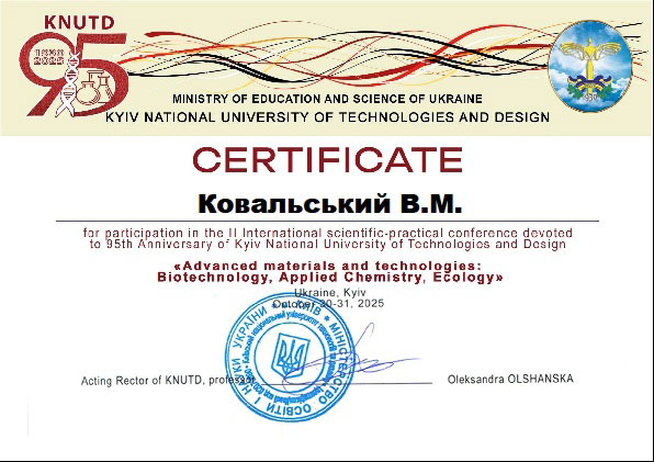 In addition to laboratory research, club members actively presented their achievements at international scientific venues, including the II International Scientific and Practical Conference dedicated to the 95th anniversary of Kyiv National University of Technologies and Design, “Innovative Materials and Technologies: Biotechnology, Applied Chemistry, Ecology” (Kyiv, 30-31 October 2025), as well as the IX International Scientific and Practical Conference on Textile and Fashion Technologies (Kyiv, 16 October 2025).