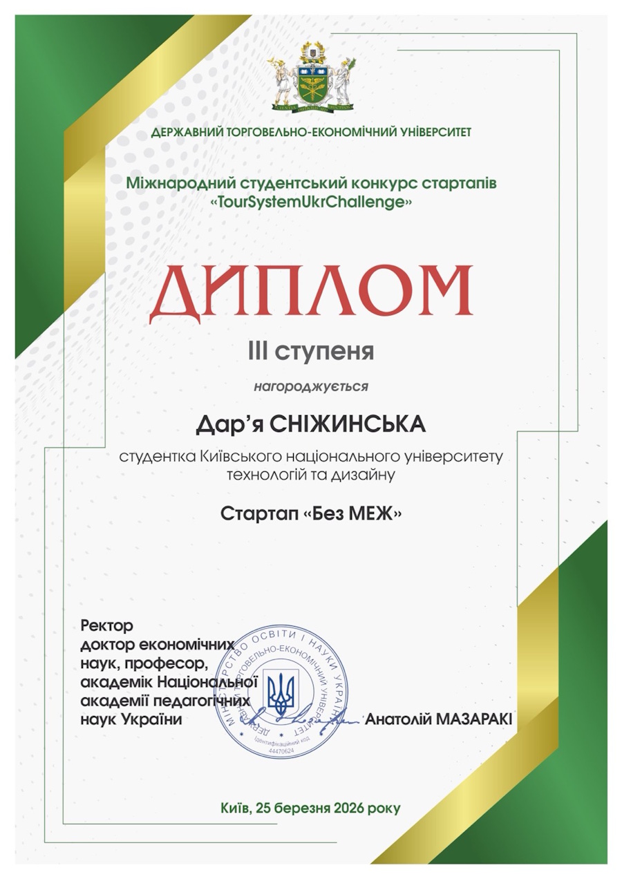 The project stood out for its high level of innovation, relevance to the ongoing transformation of the hospitality industry, and strong practical orientation. According to the competition results, the project received high recognition from the expert jury, and Darіa Snizhynska was awarded a third-degree diploma.